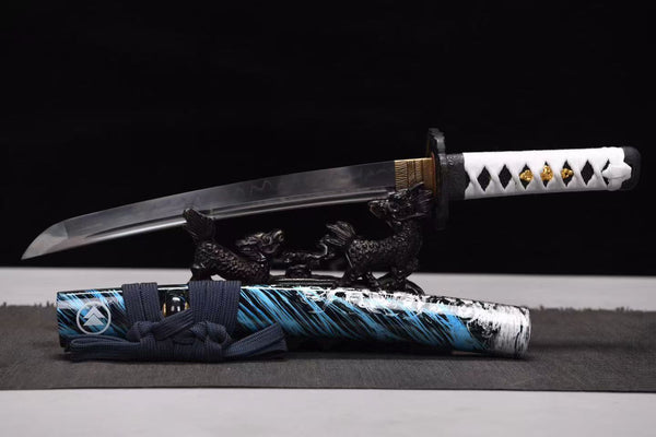 Sword: Zinc alloy        Handle: Imitation fish skin        Scabbard: Hand-painted scabbard made of high-mountain wood          Steel: T10 steel hand-forged, covered with clay and fired, bullet-groove fifteen hand-grinding.